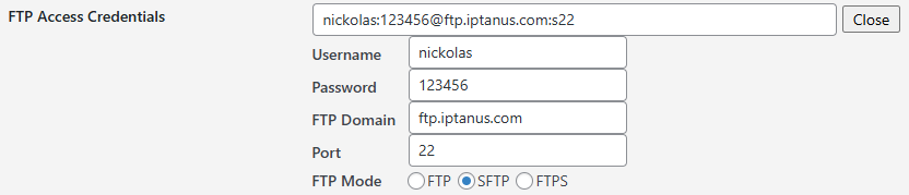 - Secure FTP (sFTP) protocol is supported, provided that the required libraries are installed on the web server. To use it put the character ‘s’ before the port like this: nickolas:123456@ftp.iptanus.com:s22